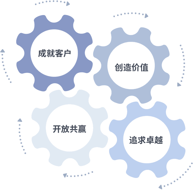 成就客户是一切决策的出发点,,,创造价值是衡量所有工作的标准,,追求卓越是我们做事做人的态度,,,开放共赢是我们的格局也是最终的结果。。。。价值观的齿轮环环相扣,,,推动着组织里的每个人不断向前。。。